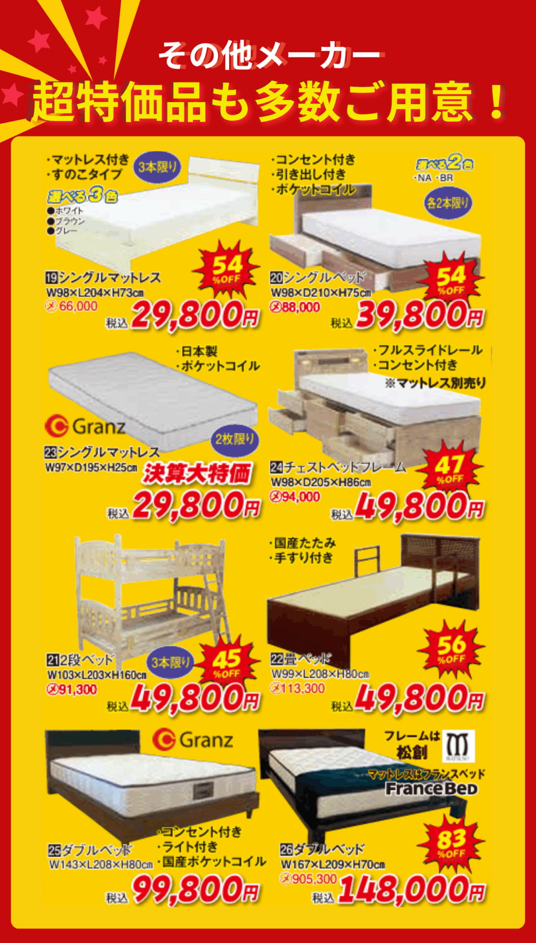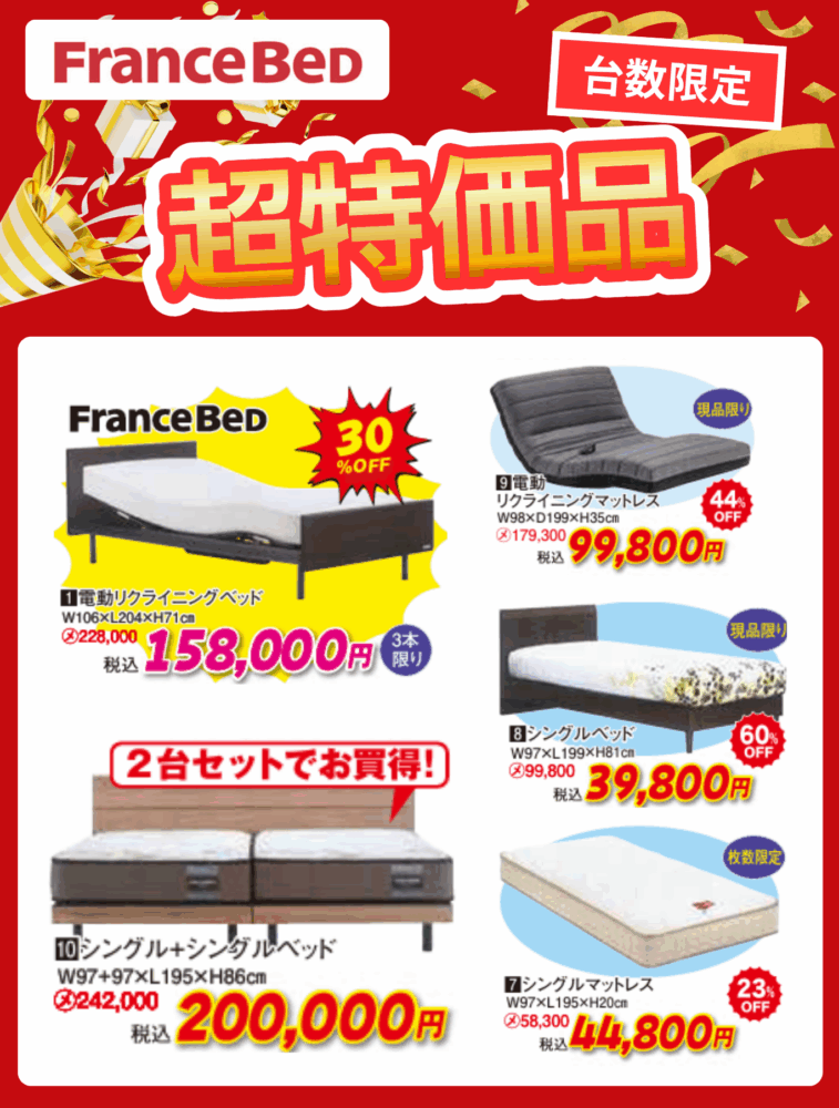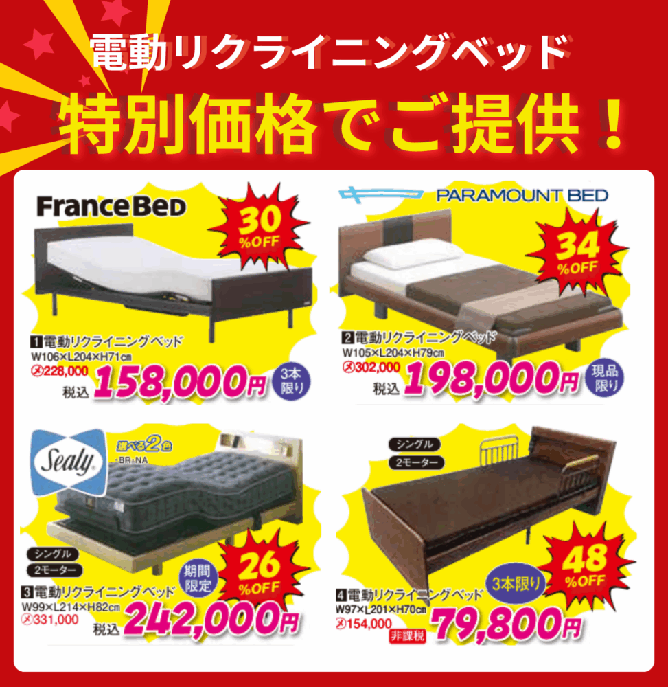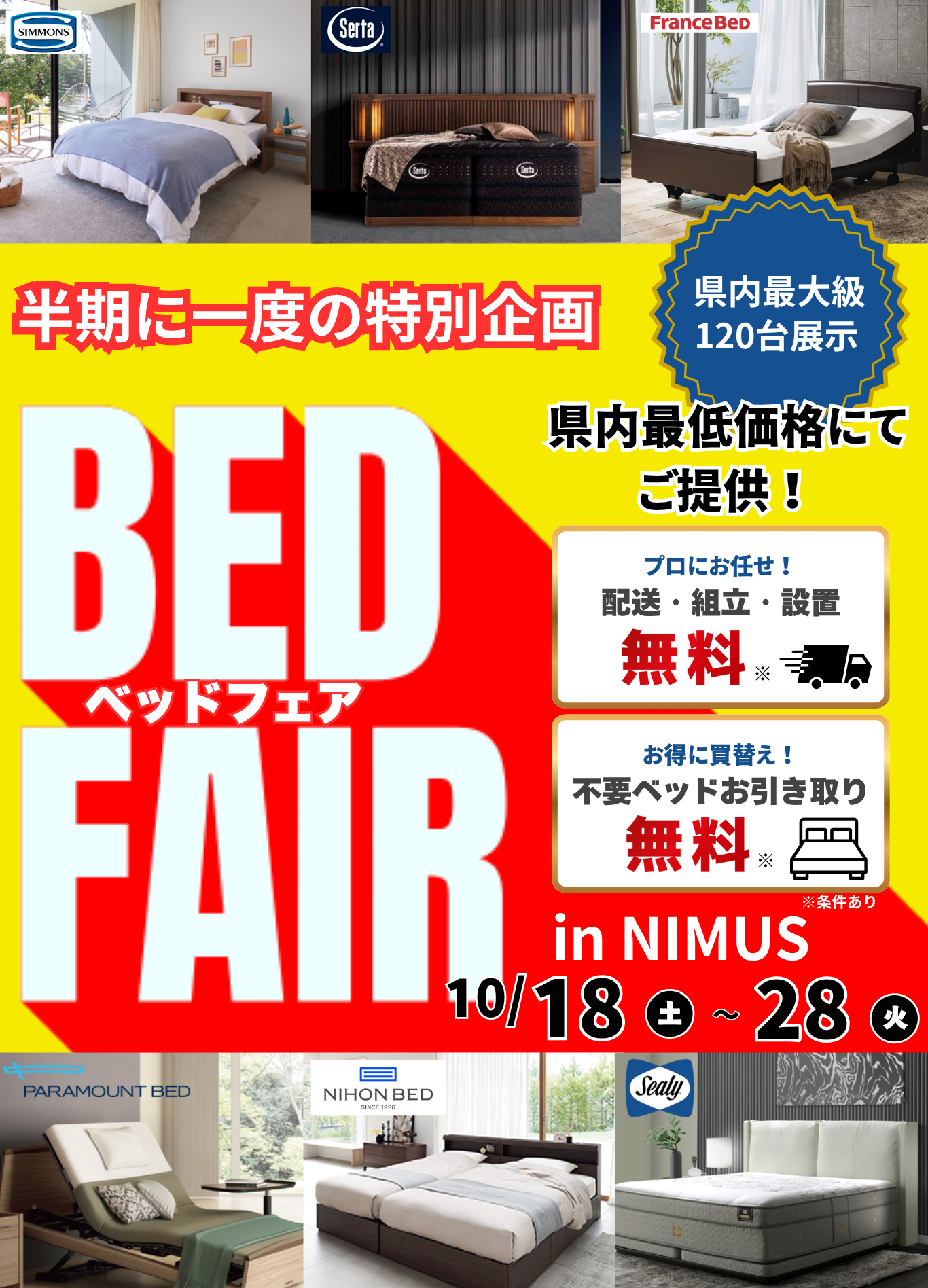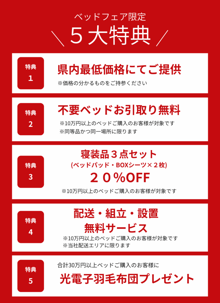 ニームズでは、半期に一度の特別企画であるベッドフェアを開催いたします。期間中は様々な特典をご用意しております。