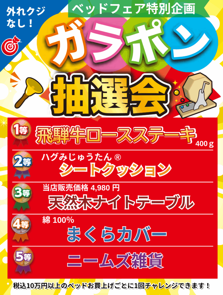 魅力的な特典ばかりですが、特に注目したいのが「ガラポン抽選会」🎉税込10万円以上のベッドご購入で1回チャレンジできます。1等は飛騨牛ロースステーキで外れクジなしです!ぜひチャレンジしてください✨