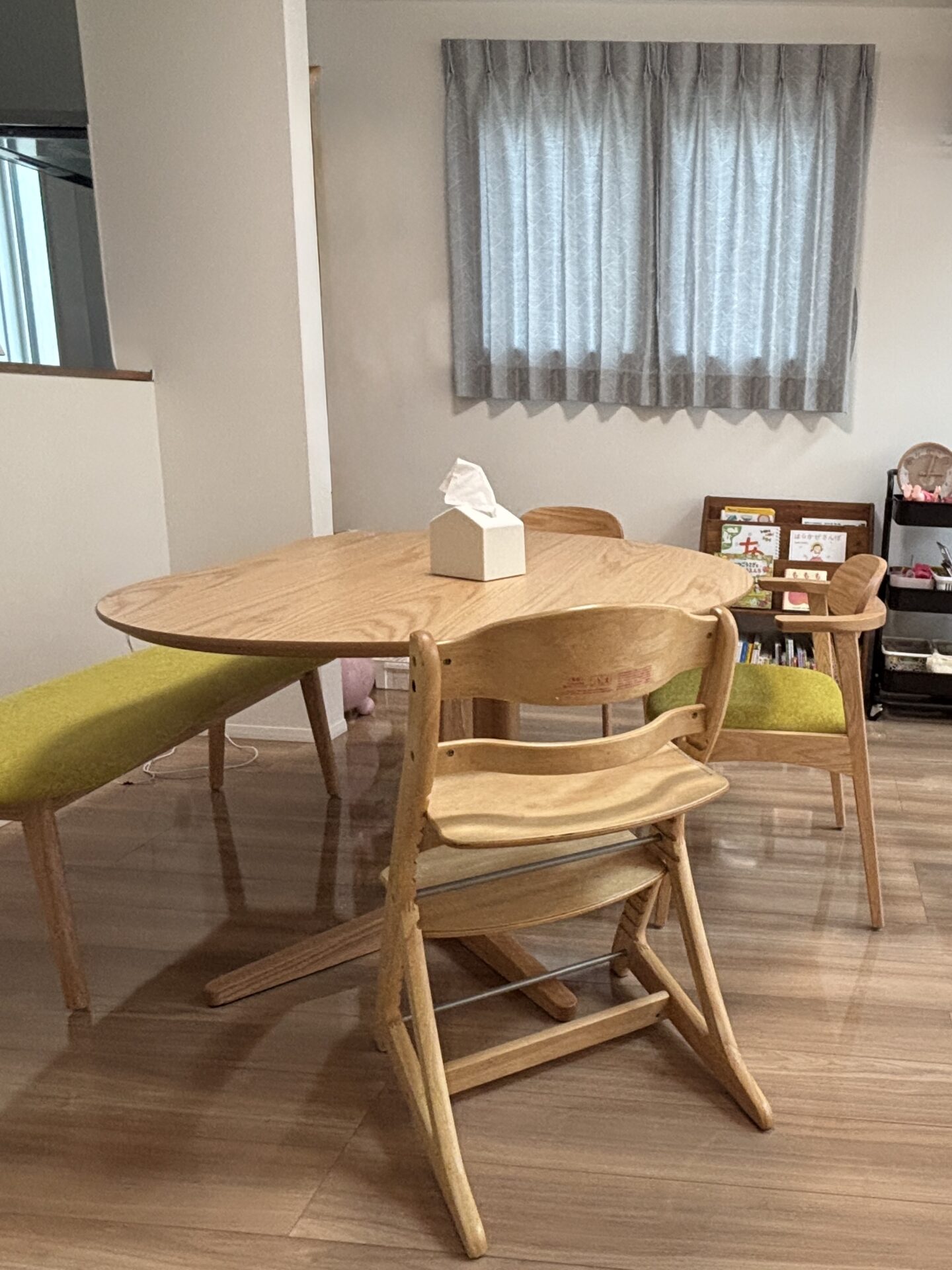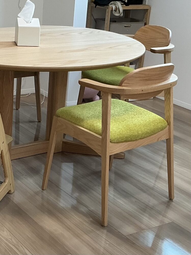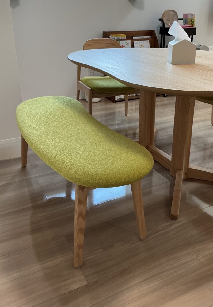その先には、開放感のある吹き抜けのリビングダイニングが広がります。自由にレイアウトできるビーンズ型のダイニングテーブルに、ミモザ色のチェアとベンチを合わせ、空間にやさしい彩りを添えています。