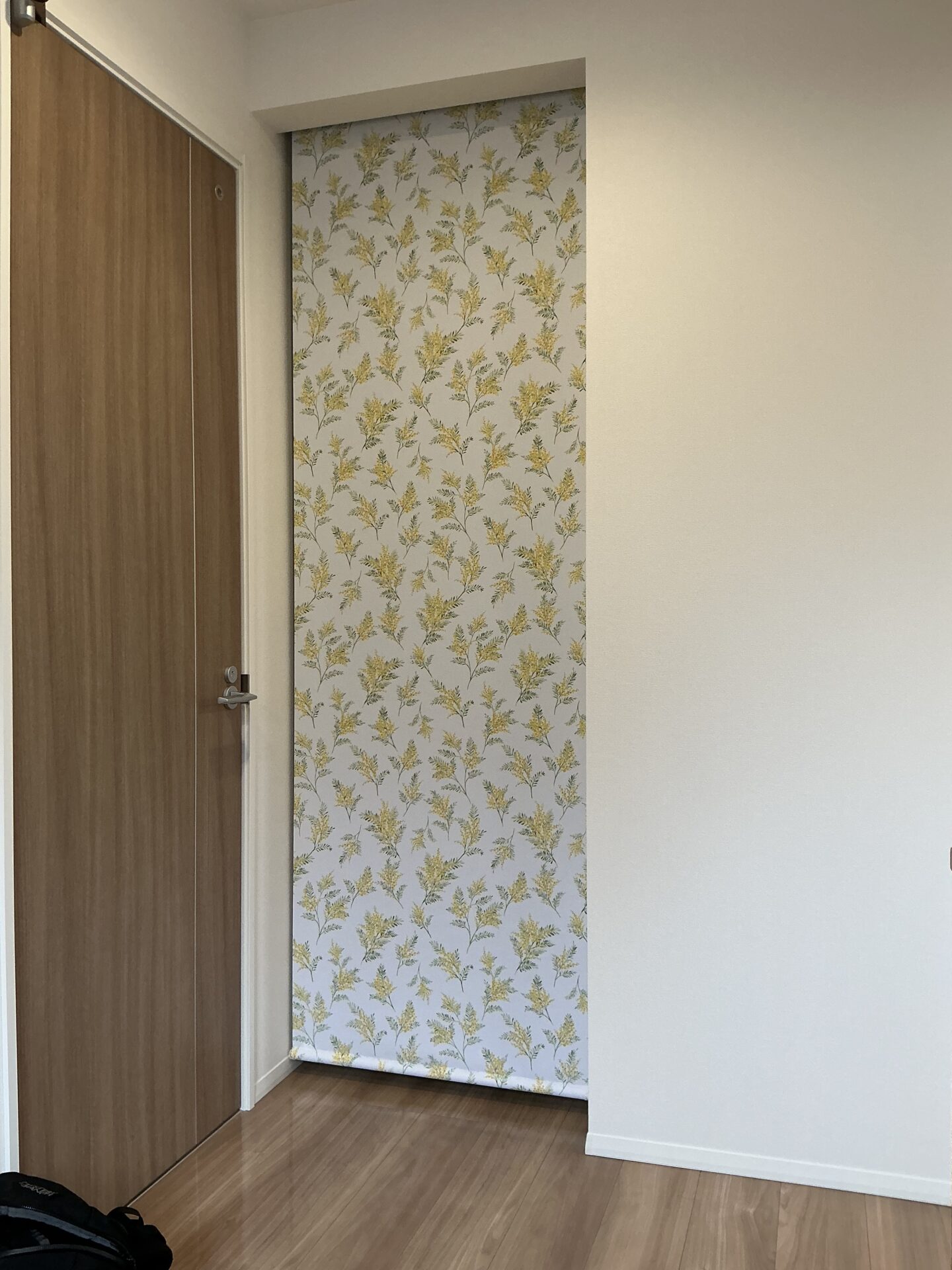 玄関ドアを開けると、最初に目に飛び込んでくるのは、回遊廊下に設置されたミモザ柄のロールスクリーン。内付けにすることで、すっきりとした見た目に仕上げています。