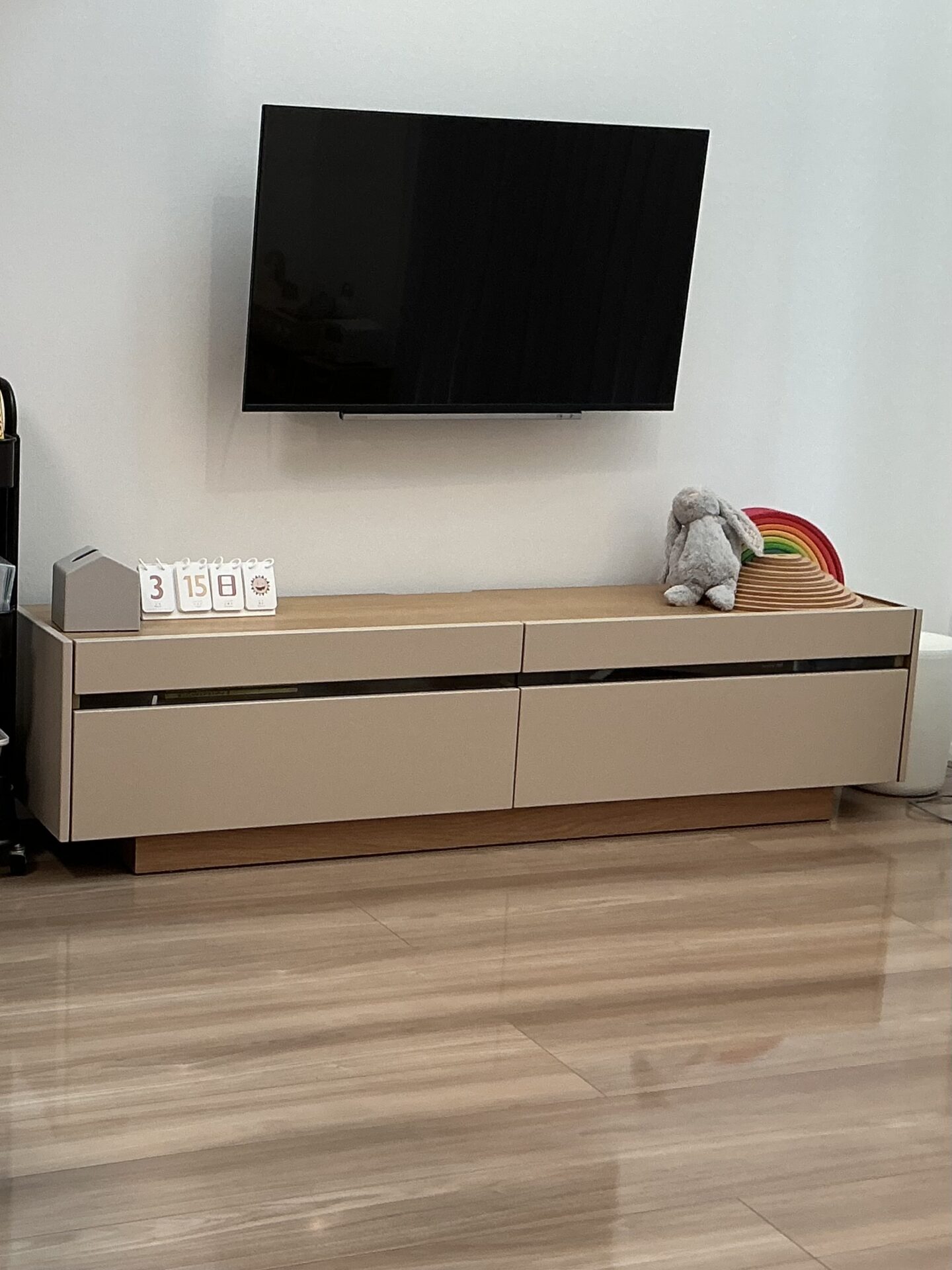 その奥には、馴染みの良いベージュカラーと木目のテレビボードを配置。人気のタチカワブラインドの縦型ブラインド「エアレ」から入る光も美しく、S様とお部屋の雰囲気にぴったりのリビングが完成しました。